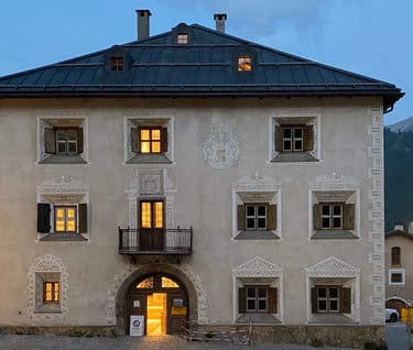 In the Engadine Valley, the ancient art of Sgraffito transforms simple village houses into storytelling canvases. Artists carve delicate patterns, family crests, and religious symbols directly into layers of fresh plaster. The technique, introduced in the 16th century, blends Italian Renaissance influence with Alpine traditions. Typical motifs include suns, stars, vines, and inscriptions in Romansh, celebrating local culture and beliefs. Each façade is unique, a handcrafted masterpiece shaped by the history and pride of the families who lived there. The muted earth tones and striking white lines create a timeless contrast against the rugged mountain backdrop.