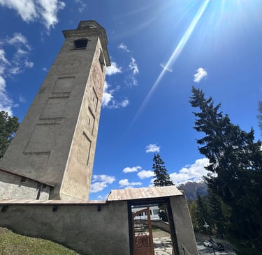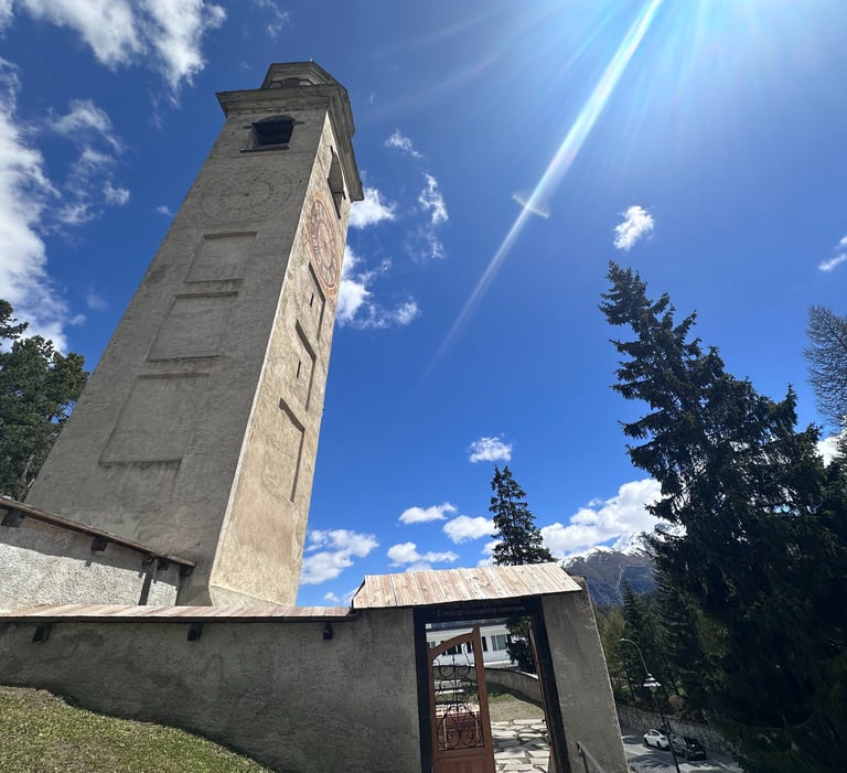 The first is the old Church of Saint Mauritius, known today mainly for its leaning bell tower, located near the Hotel Kulm along the old road to Celerina. This church was already mentioned in 1139 as Ecclesia Sancti Mauritii. It was dedicated to Saint Maurice, the leader of the Theban Legion who, according to legend, was martyred in 286 AD for refusing to persecute other Christians. Over the centuries, the church was expanded and altered many times. In 1893, the main part of the church (the nave) was demolished because the ground beneath it had become unstable due to a prehistoric landslide, still visible today near the area called Sass Runzöl. Only the bell tower remains today, built partly in the early 1200s. It still shows Romanesque features like blind arches and is topped by an octagonal dome added in 1672. After a new church was built in the town center in the 18th century, the old church was used mostly for funeral services, as it was close to the cemetery. Some gravestones are still visible today.